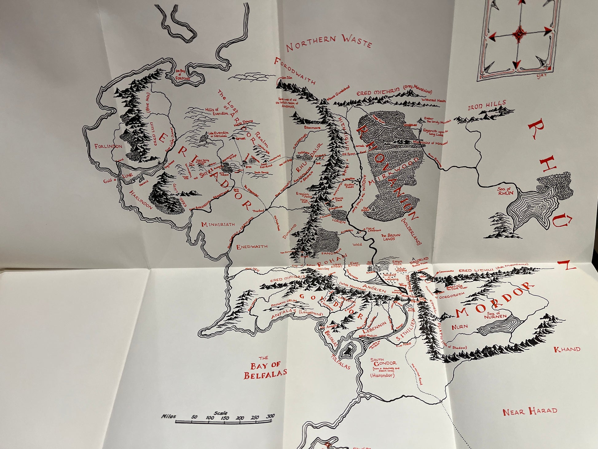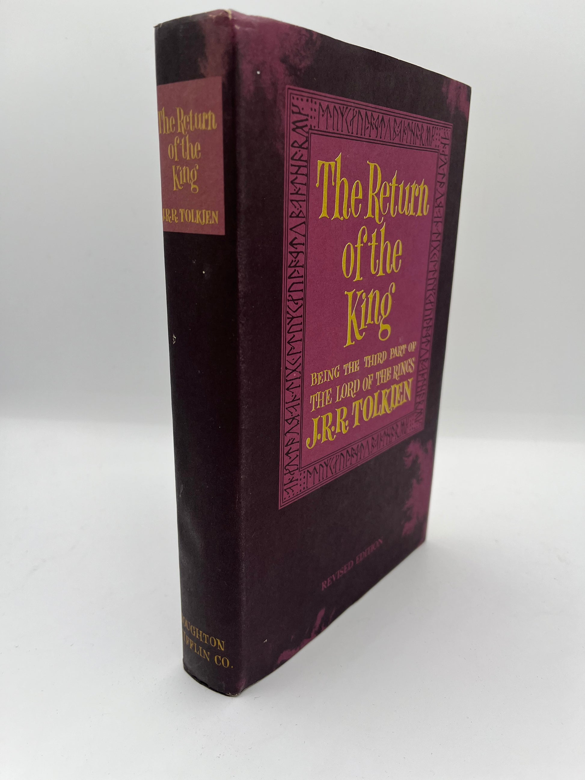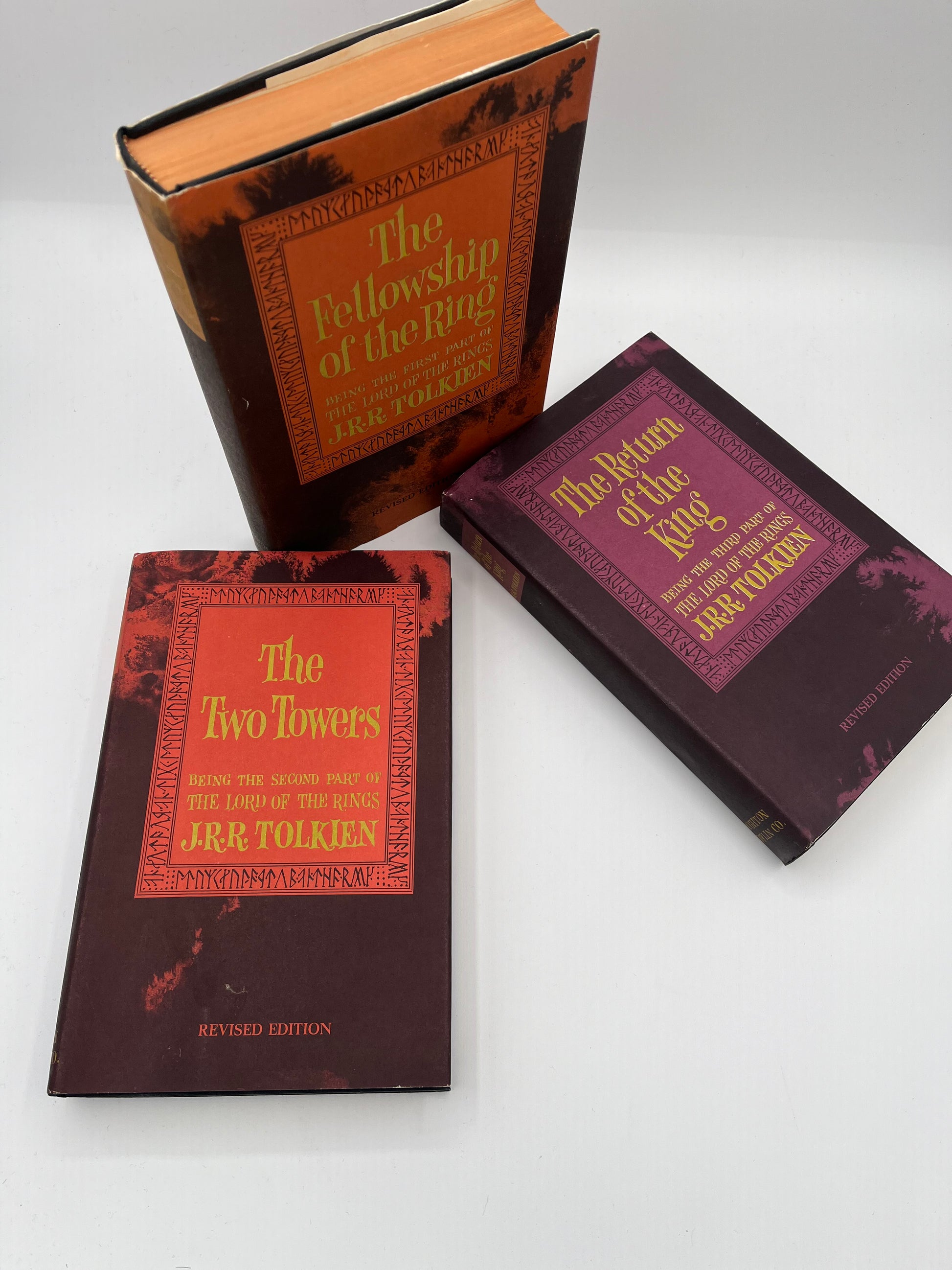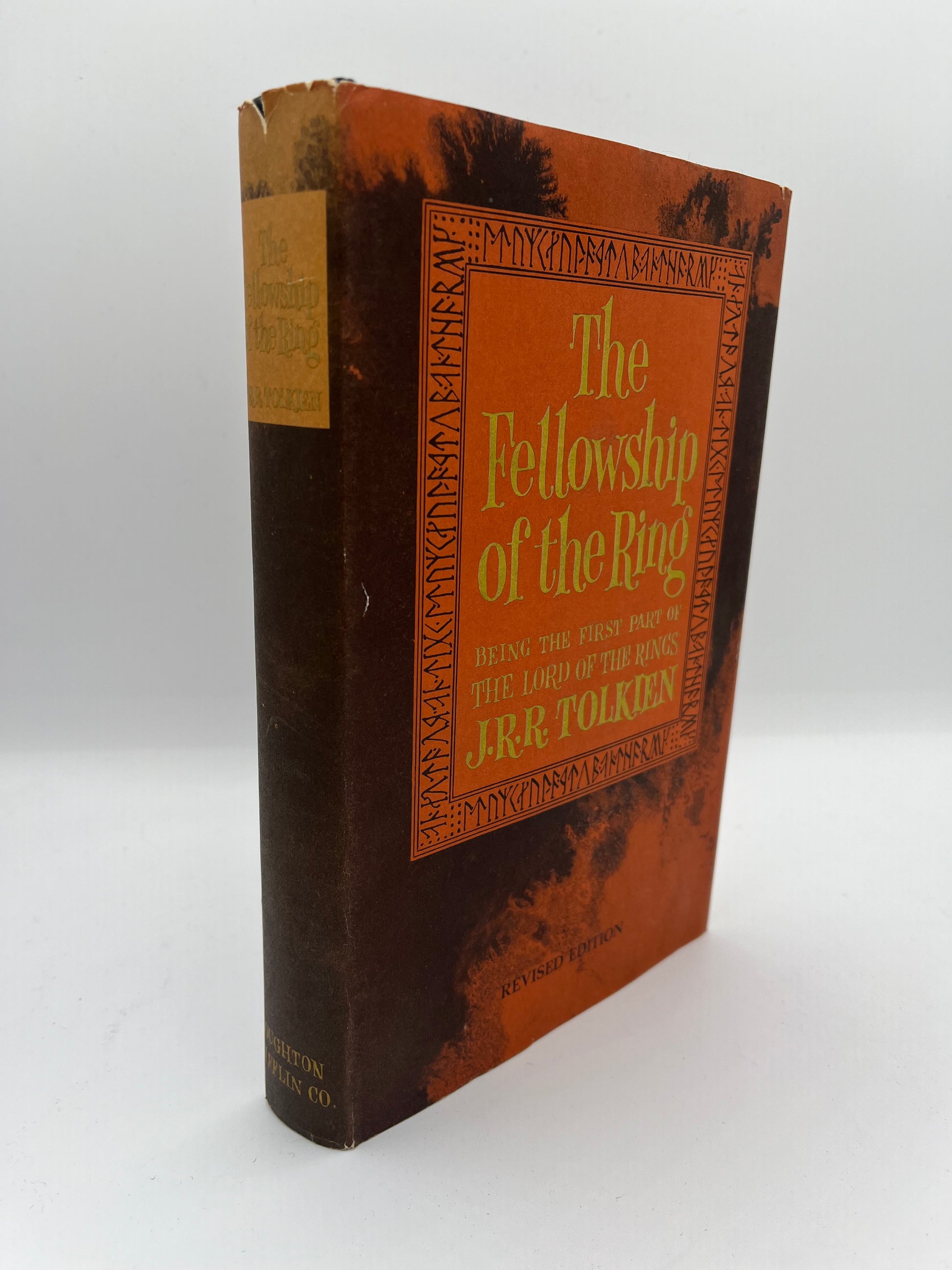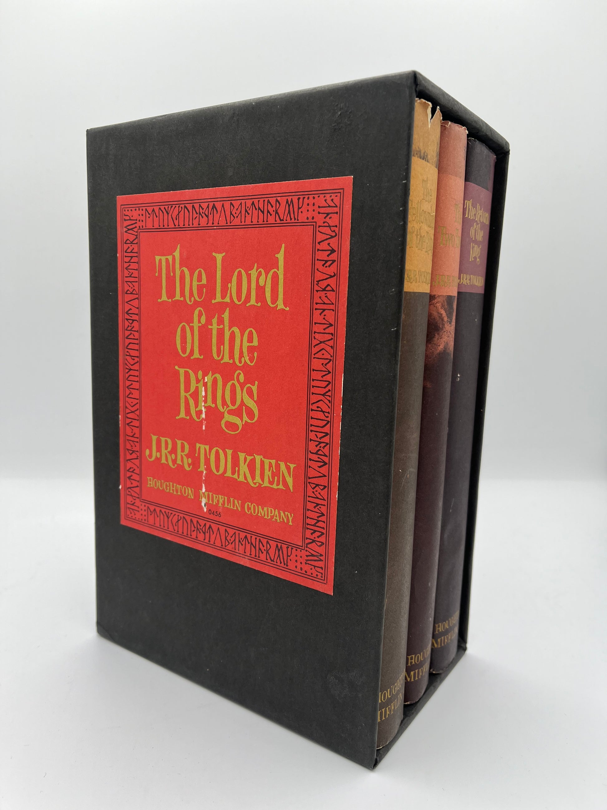 New York: Houghton Mifflin Co. Tolkein, J.R.R. "The Lord of The Rings," revised, second edition set in slipcase. Fourth printing. Three fine octavo volumes in good to very good dust jacket. Slip case good with some surface scrapes and moderate deterioration to black papers at back top corner. A couple DJs show a few slight tears to edges. Each volume includes a fold out map of Middle Earth in Fine condition.