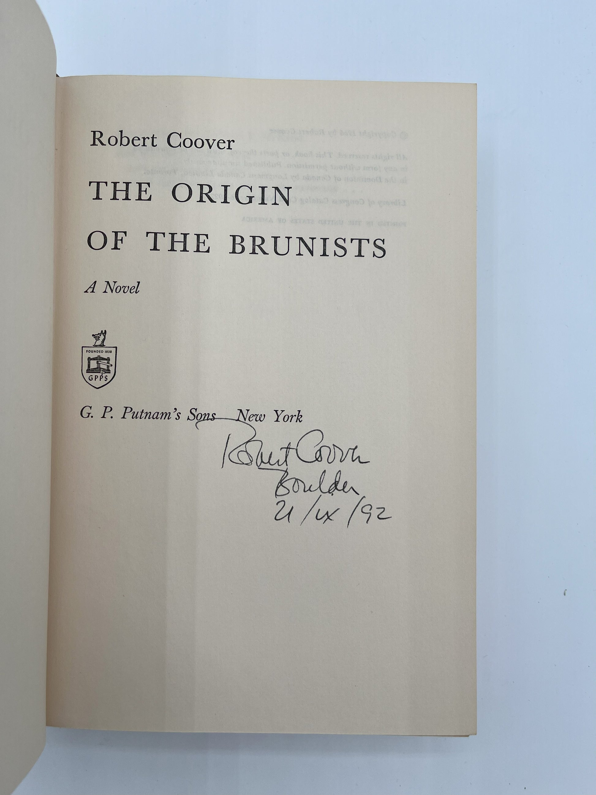 New York: G.P. Putnam's Sons, 1966. Coover, Robert "The Origin of The Brunists," A 1st/1st signed and dated by the author on the title page. Near fine book in handsome, espresso colored cloth stamped with white dove, and gilted title on spine. Some rubbing to extremities of the boards and underneath the page block. Dust jacket in same condition. In mylar sleeve, one to spots of extremely minor edgewear. Overall a handsome signed edition from a writer responsible for some truly wild prose. 441 pp.