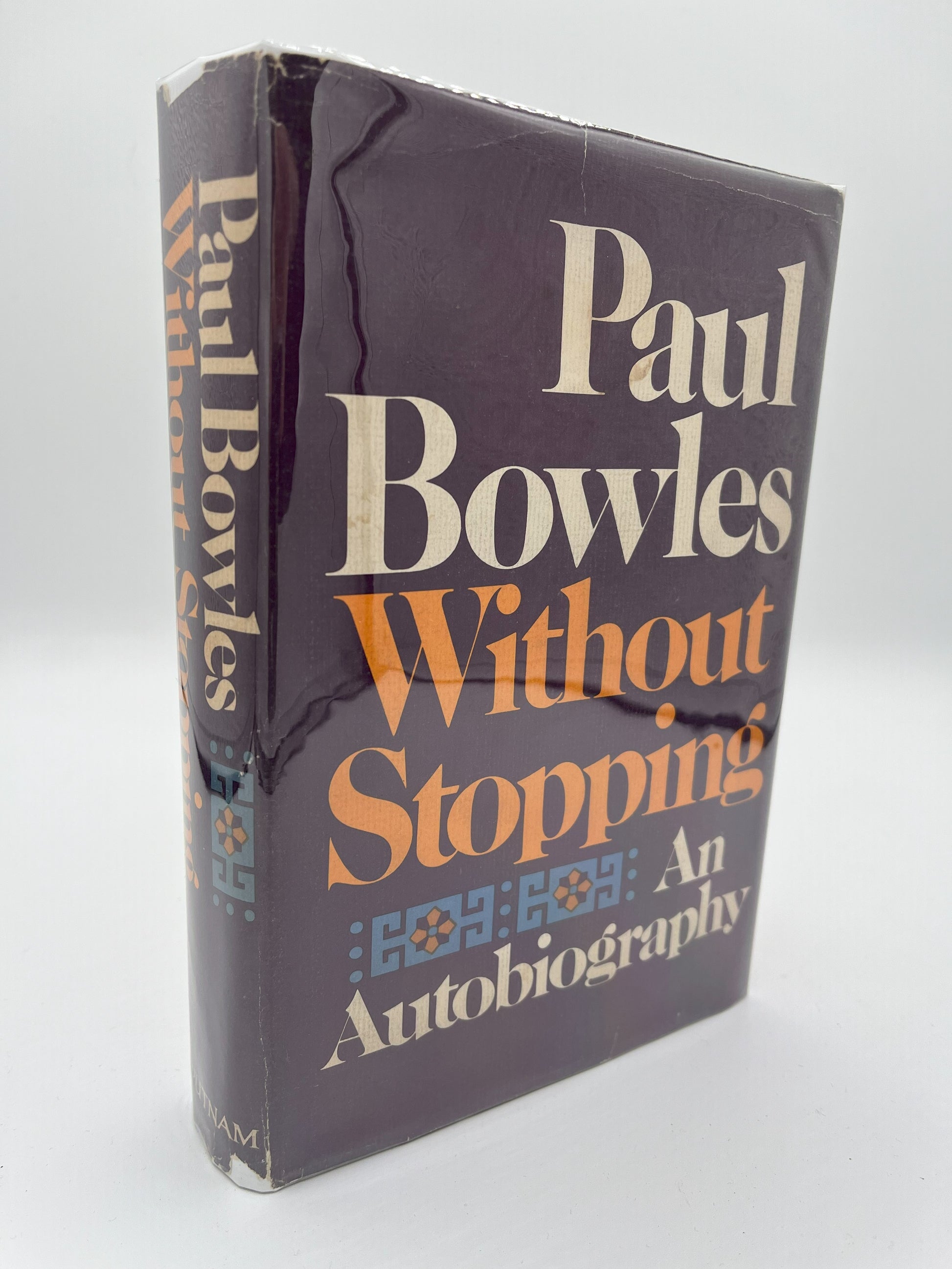 New York: Putnam, 1972, Bowles, Paul “Without Stopping: An Autobiography,” hardcover, first edition. Good copy of Bowles own account of his life. Some discoloration to edge of pages, boards show slight toning. Bottom left corner of back cover torn half an inch. Edgewear to spine. 379 pp
